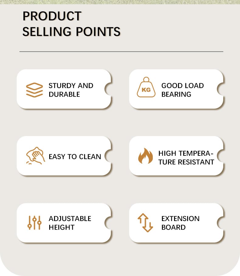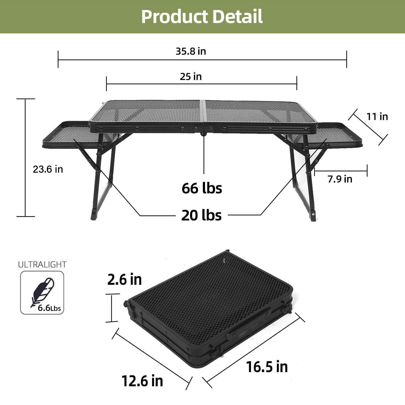 NEW DESIGN: Camping table with wing boards, unique coated mesh top and wing boards are designed to hold more drinks, stoves and snacks. In addition, this camping table is effective in avoiding water accumulation and heat resistance.