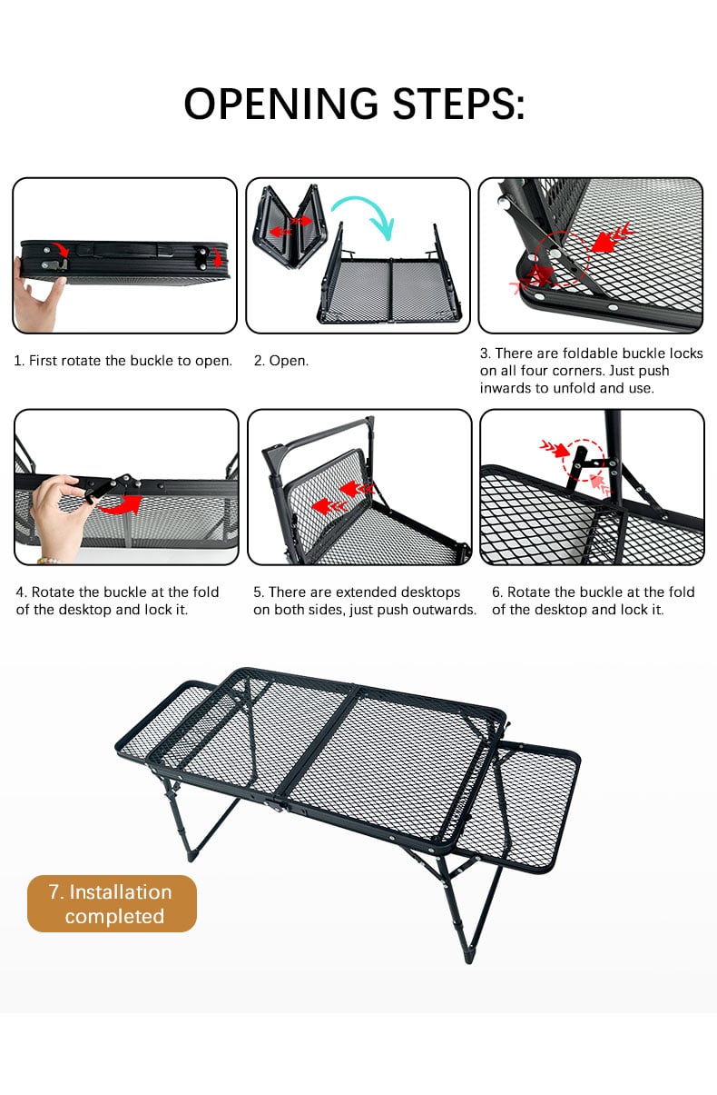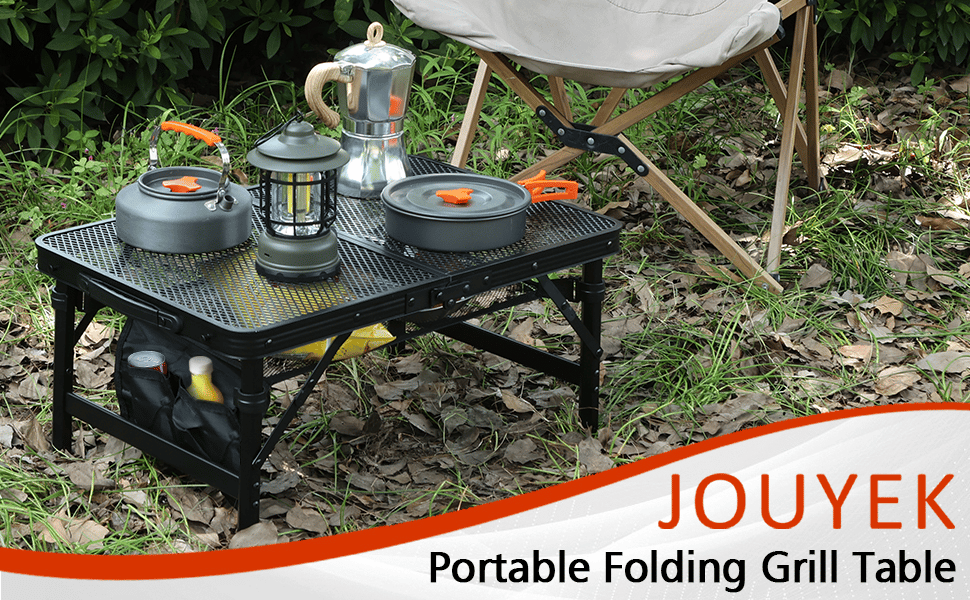 WATERPROOF AND HIGH TEMPERATURE RESISTANT: Featuring a specially coated mesh table top, this BBQ table is effective in preventing water accumulation and rust. It is also made of heat-resistant materials so you can set up a small grill and have a great time.